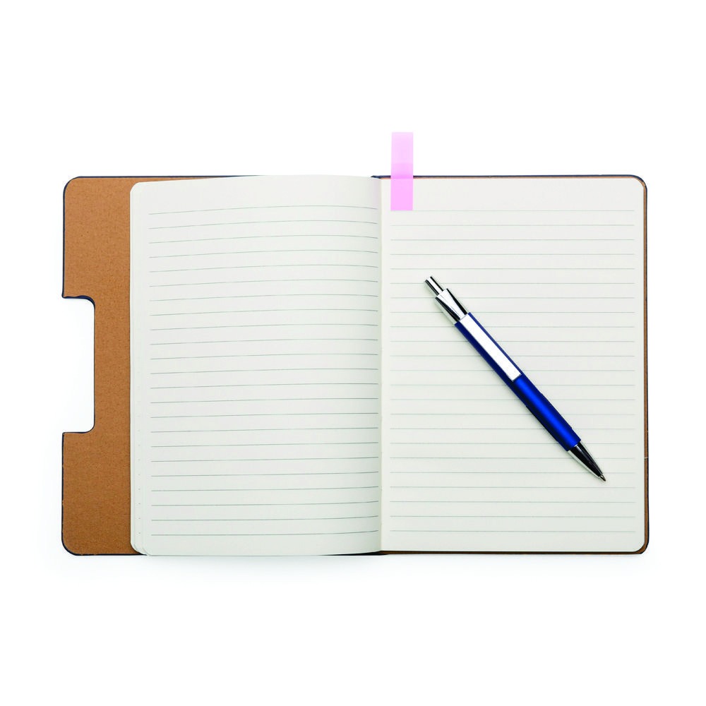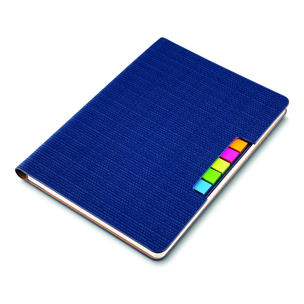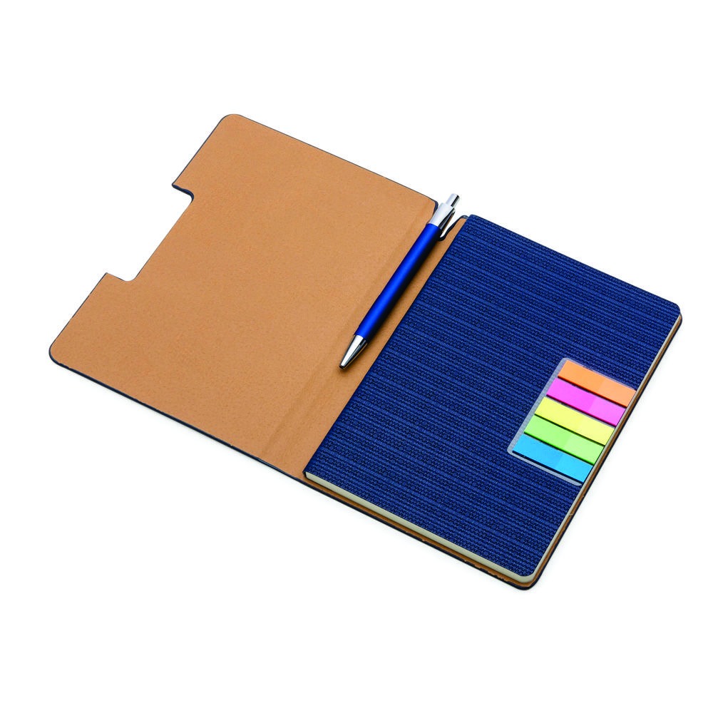 Caderno de anotações, com sticky notes, capa em material Sintético, miolo 80 folhas pautadas na cor bege.