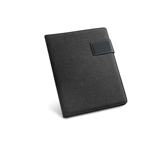 Pasta A5. Linho sintético e c. sintético. Fecho magnético. Bloco: 20 folhas pautadas. Placa metálica com acabamento emborrachado. Acessórios não inclusos.