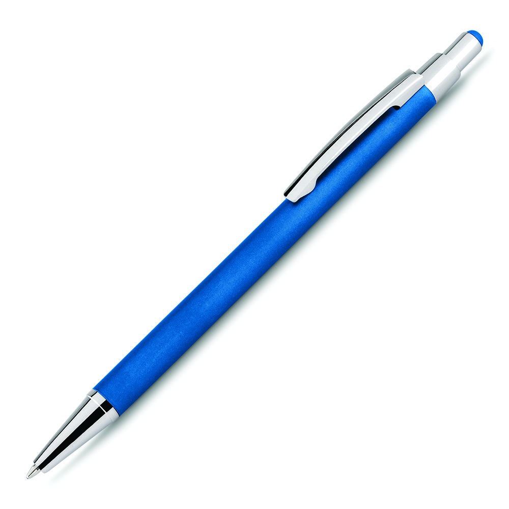 Caneta esferográfica em metal com ponta touch escrita em azul.