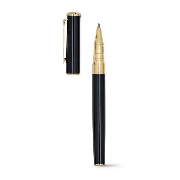 Conjunto de roller e esferográfica. Metal. Elementos com banho de ouro de 18 quilates. Esferográfica: 1,5km de escrita. Em estojo almofadado.