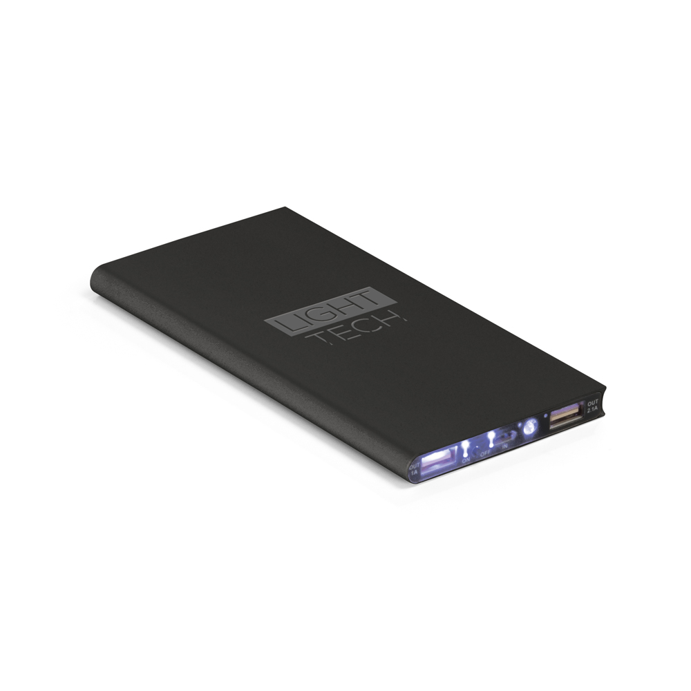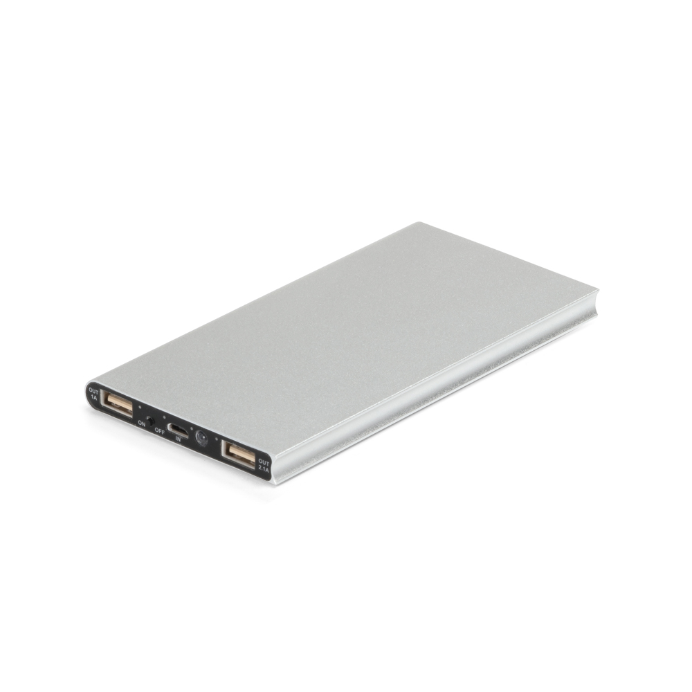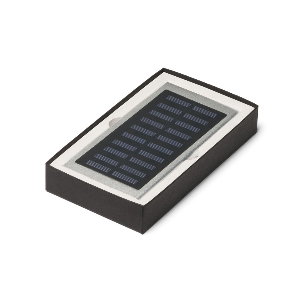 Bateria portátil. Alumínio. Com painel solar e LED. Bateria de lítio. Capacidade: 8.000 mAh. Tempo de vida ≥ 500 ciclos. Com entrada 5V/1A, saída 5V/1-2.1A e 2 portas USB. Incluso cabo USB/micro USB para carregar a bateria. Fornecida em caixa presente.