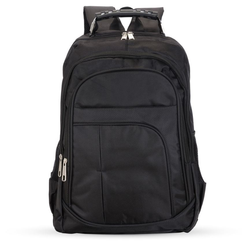 Mochila nylon poliester para notebook. Possui compartimento grande com bolso interno para notebook, dois compartimentos médios, bolso pequeno frontal e bolsos laterais de rede. Zíperes prata, alça superior com pegador emborrachado e tira de silicone com cabo de aço interno para garantir maior resistência, alça superior de nylon, alças ajustáveis para as costas revestidas com espuma e parte traseira também revestida de espuma para maior conforto.