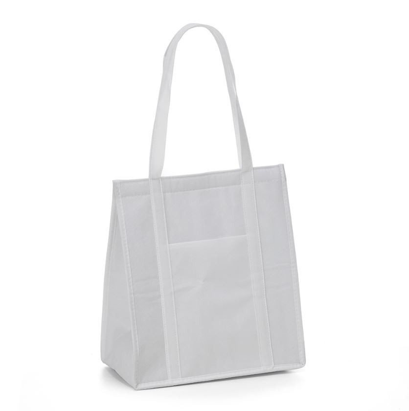 Sacola térmica com capacidade de 18 litros, contém fechamento em velcro e bolso frontal.