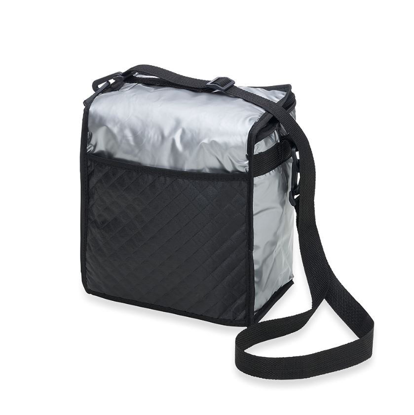 Bolsa térmica de pvc laminado com capacidade de 11 litros, contém revestimento interno em polietileno atóxico soldado (não vaza), bolso sintético externo de matelassê e alça tiracolo ajustável de polipropileno.