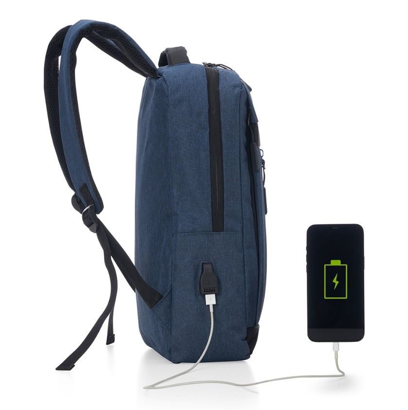 Mochila confeccionada em nylon com compartimento para notebook até 15,6 polegadas. Contém compartimento grande com divisórias para documentos, eletrônicos e caneta, dois compartimentos frontais com abertura vertical, bolso lateral e adaptador USB externo com cabo acoplado, permitindo a conexão de um carregador portátil de dentro da mochila e transferência da carga para o lado externo, ocultando o carregador e viabilizando a utilização do celular durante o processo. Contém zíperes com pegadores plásticos, alça de mão em nylon e alças para as costas ajustáveis com revestimento espumado antitranspirante.