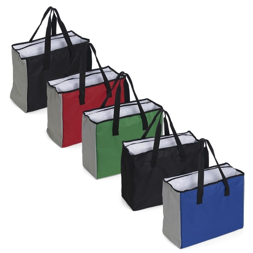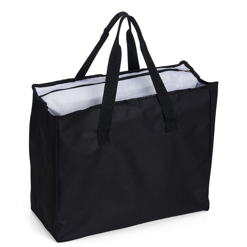 Sacola de poliéster com capacidade para 25 litros com bolso térmico. Contém um pequeno bolso interno de zíper e dois compartimentos principais, sendo um deles térmico e com fechamento de zíper.