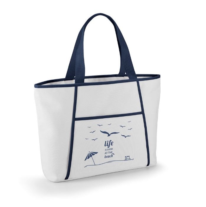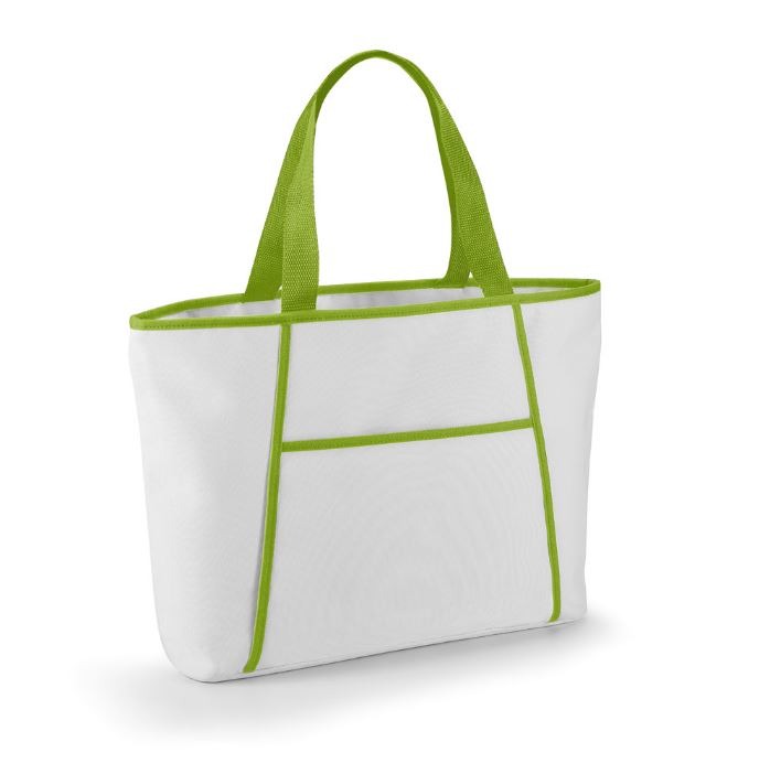 Sacola térmica em 600D com zíper e compartimento exterior aberto forrado que contém um bolso frontal. Ideal para levar para a praia. Alças em webbing com 55 cm e capacidade até 9 L. Food grade.
