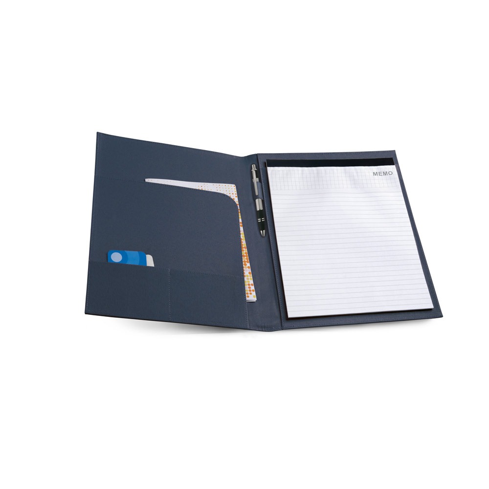 Pasta A4 em 600D com fecho elástico. A pasta contém um bloco de 20 folhas pautadas, 3 bolsos interiores e suporte para esferográfica (não inclusa).