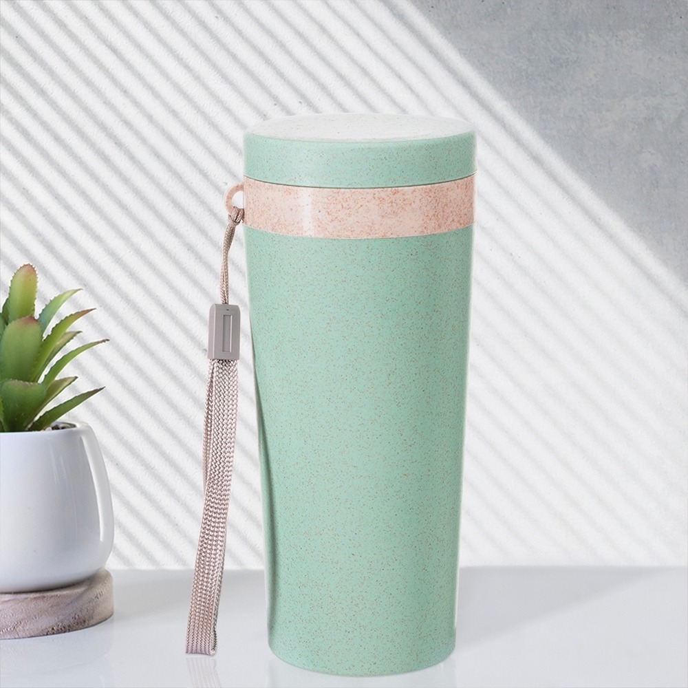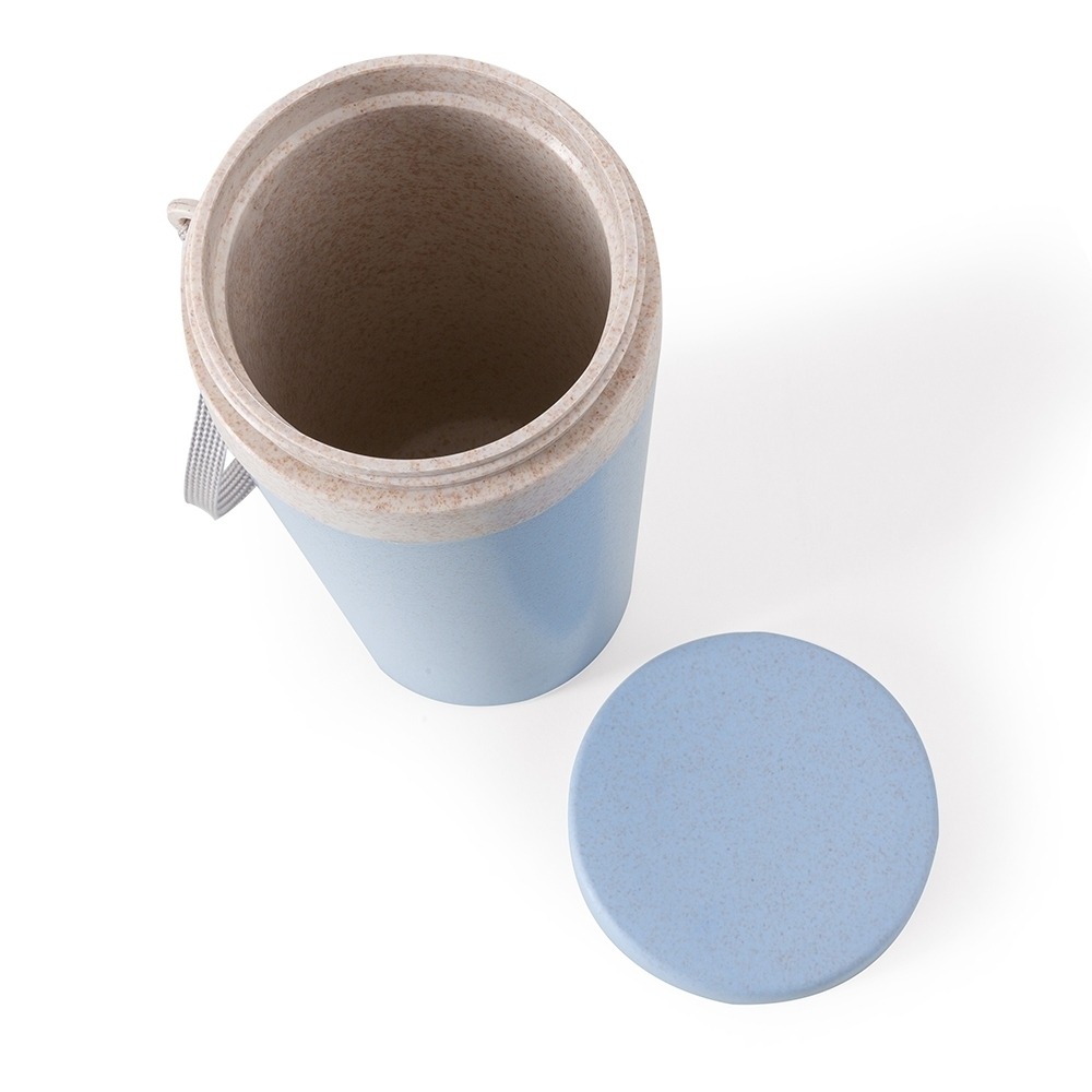Copo fibra de bambu 350ml com parede dupla e alça. Copo produzido em Polipropileno livre de BPA, possui uma tampa de vedação rosqueável e alça de nylon (removível) para transporte. Conserva a temperatura interna durante um período de 1 à 2 horas, mas não dispõe de isolamento térmico. O copo pode ser levado a lava-louças, geladeiras e micro-ondas.