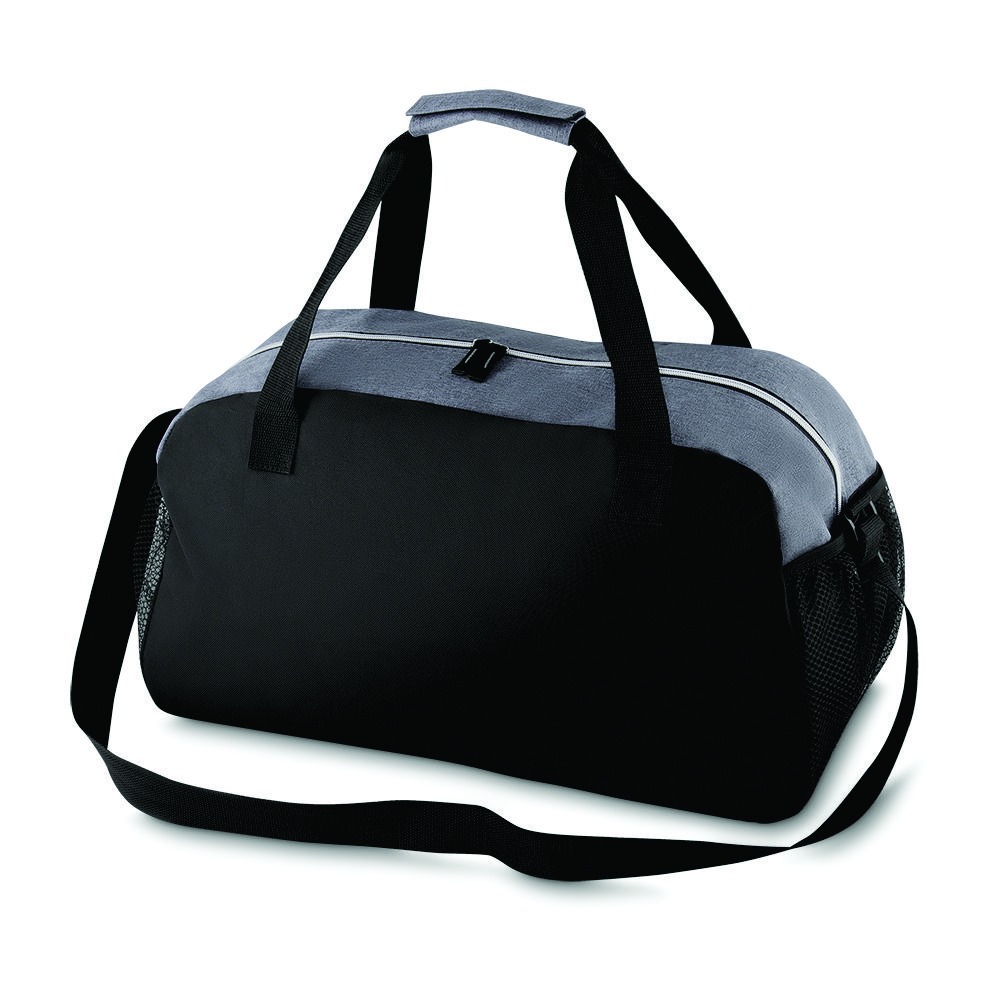 Bolsa esportiva em polyester, zíper frontal, bolsos laterais, alça de mão e ombro.