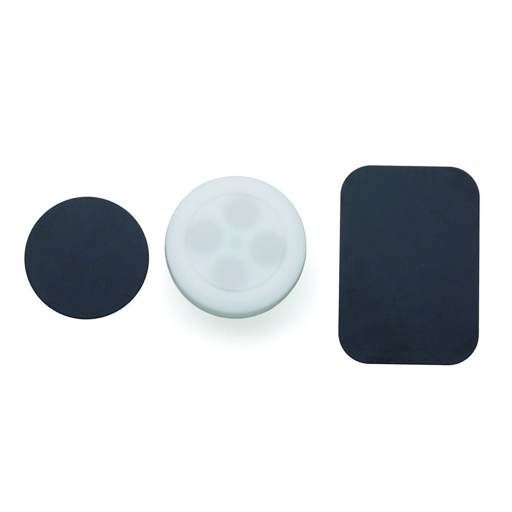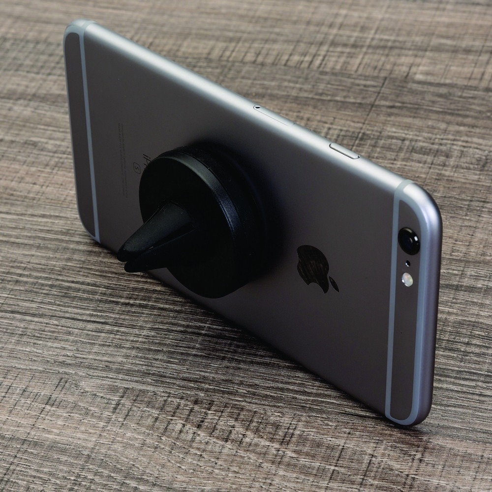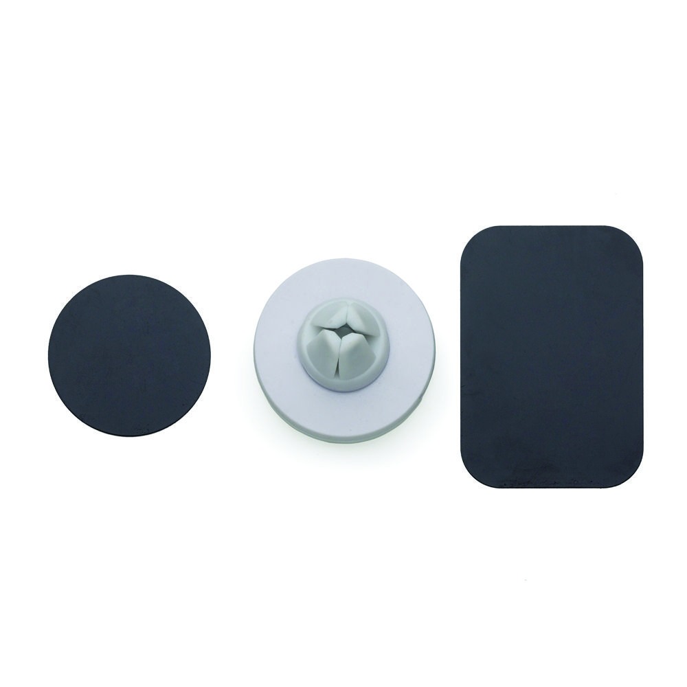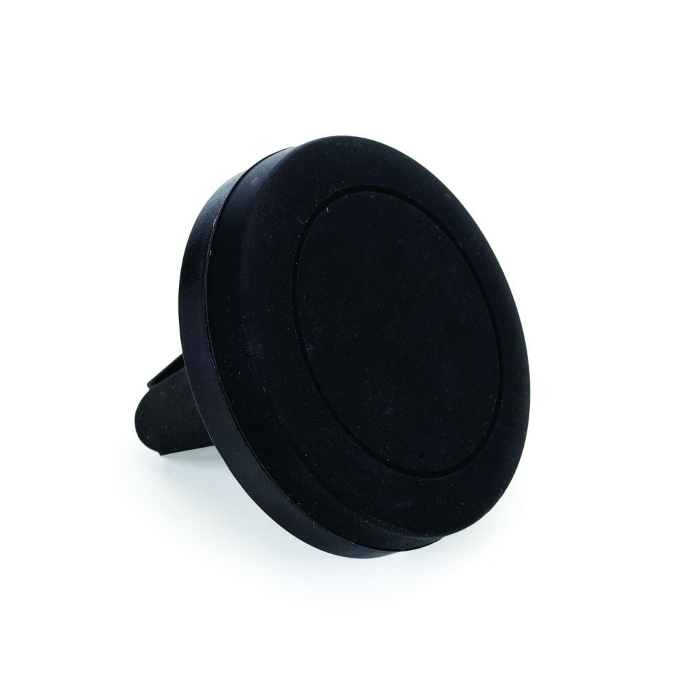 Suporte veicular magnético em plástico com revestimento emborrachado. O suporte é composto por quatro imãs e uma presilha de pressão para encaixe na saída de ar do veículo. Acompanha duas fichas metálicas com adesivo para fixação, sendo estas imantadas através do suporte.