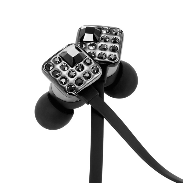 Fone de ouvido. ABS. Transmissão por bluetooth. Cada fone de forma quadrangular possui 13 cristais Swarovski. Fornecido com bolsa em silicone.