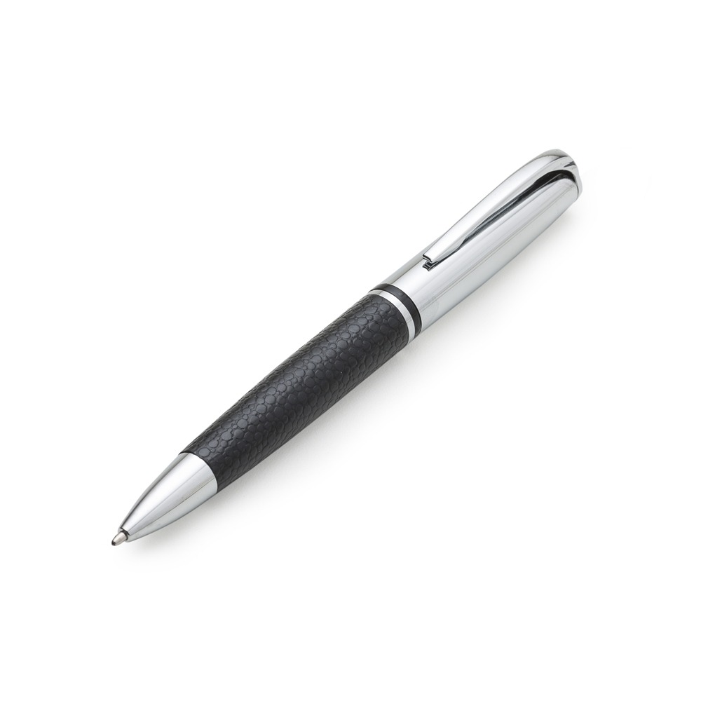 Caneta metálica com detalhe em couro sintético, carga esferográfica azul e acionamento por rotação.