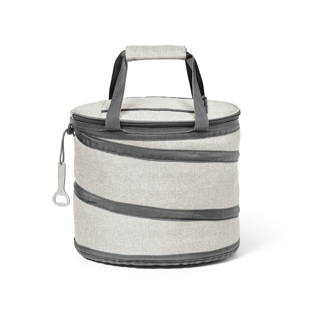 Sacola térmica flexível em 600D com zíper duplo, interior forrado com PEVA e abridor de garrafas. Bolso superior com zíper, alças em webbing, com reforço e capacidade até 15 L. Food grade.