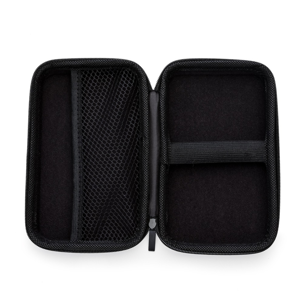 Estojo couro sintético com zíper, possui rede interna e elástico de nylon. Case utilizada para montar kits tecnológicos.