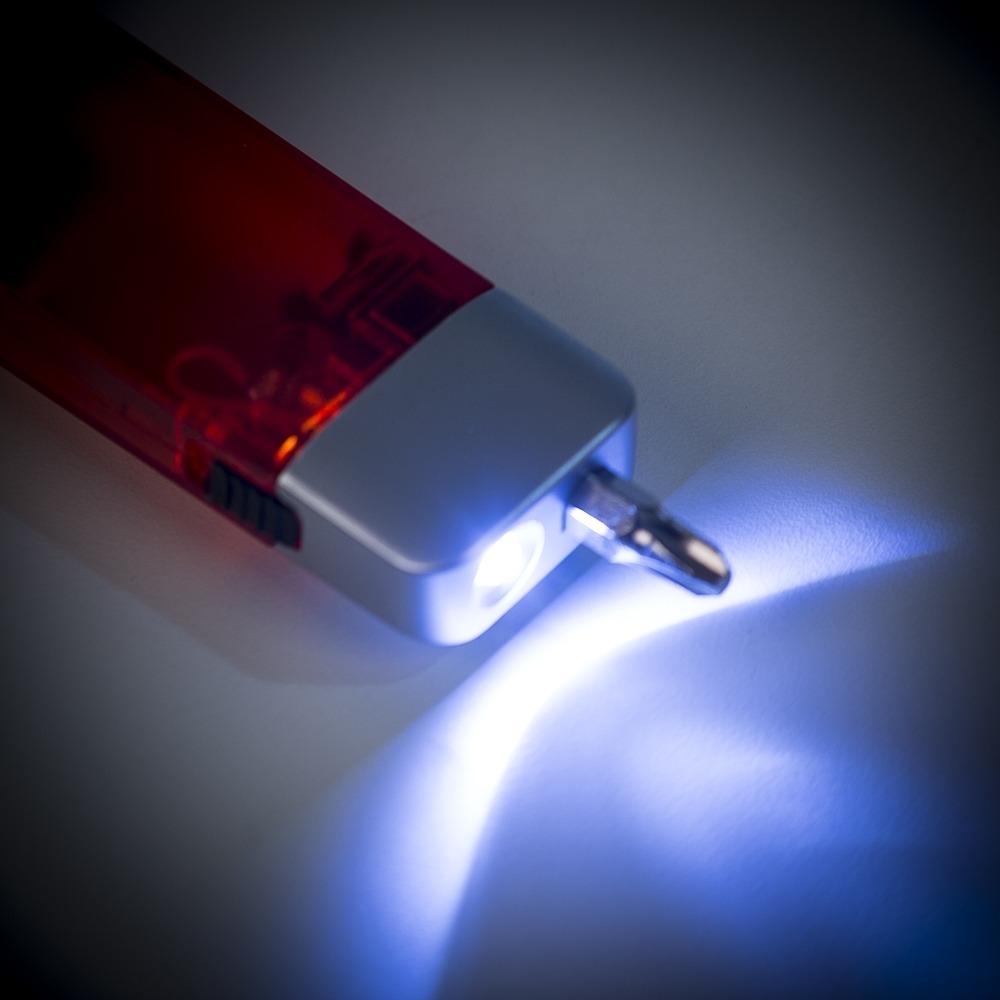 Kit ferramenta plástico com 6 peças e lanterna. Corpo fosco colorido, parte superior detalhe prata com suporte para as chaves e prendedor, lanterna e botão superior lateral para acender/apagar lanterna. Possui 3 chaves Philips e 3 chaves fenda, acompanha 3 baterias AG3. Chaves ficam em compartimento interno, basta pressionar a parte traseira que irá abrir uma espécie de “gaveta”.