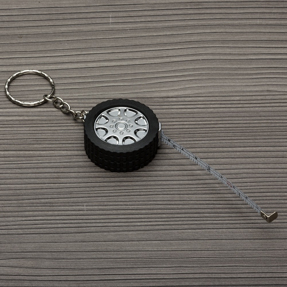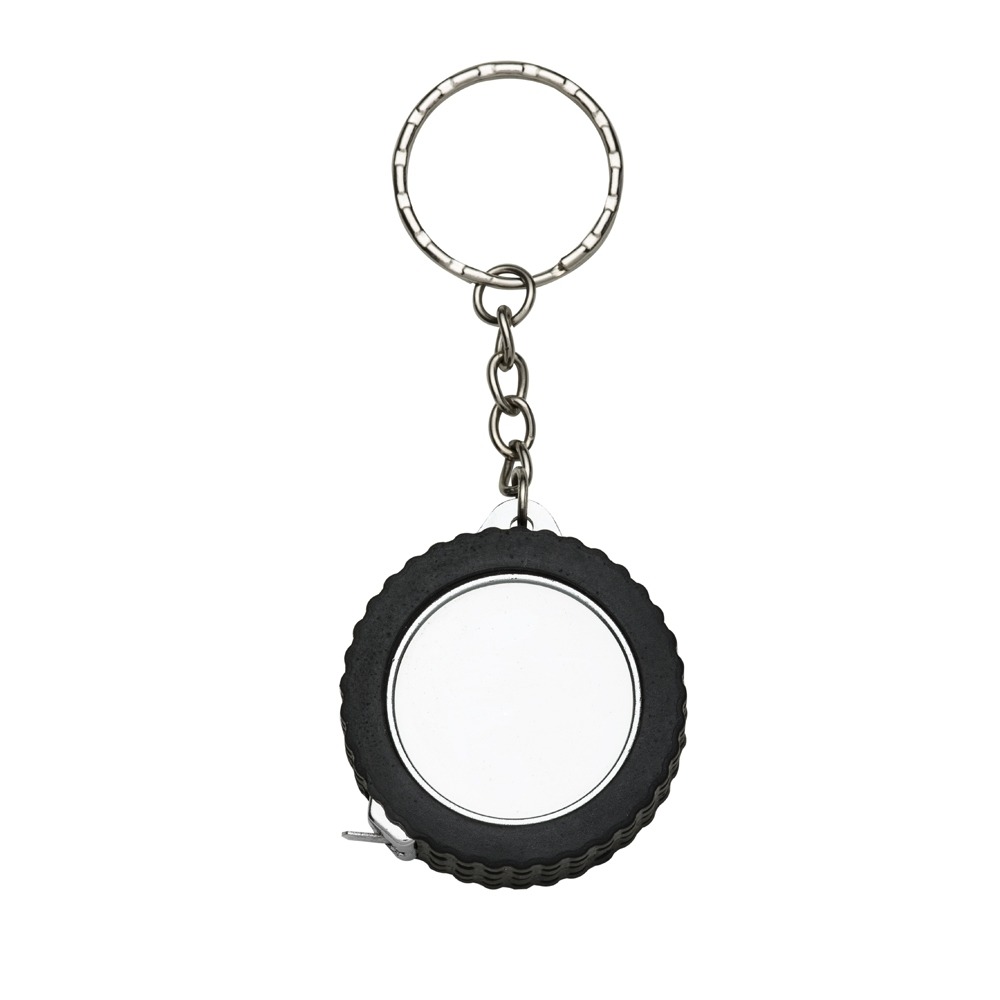 Chaveiro trena 1 metro formato pneu brilhante, material emborrachado com relevo. Detalhes do aro em plástico prata, verso liso. Trena não possui trava.