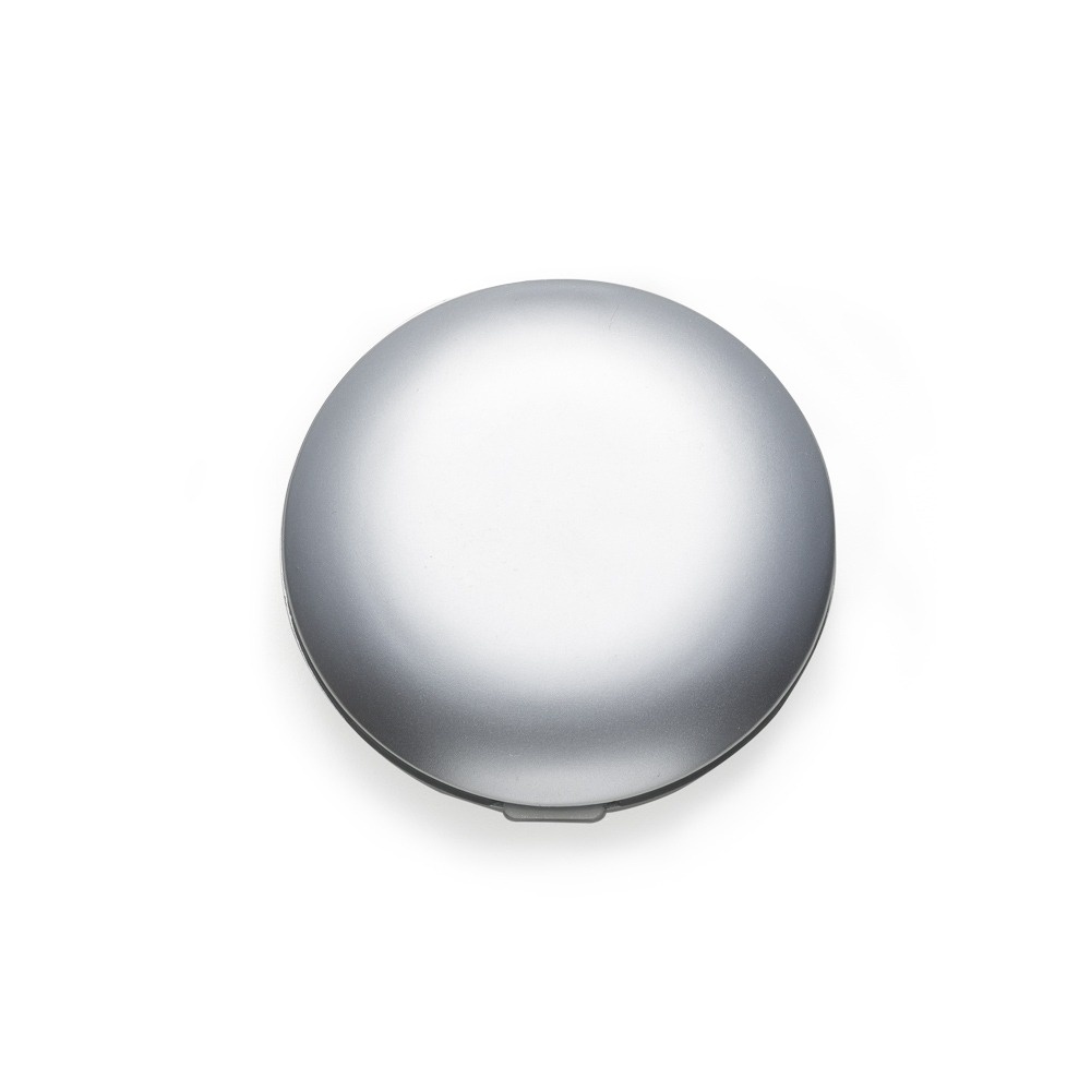 Espelho plástico redondo duplo com aumento e com luz. Parte superior não é plana(apenas círculo central), verso com tampa aonde localiza-se as baterias(quatro baterias LR41). Possui luzes na lateral interna inferior.