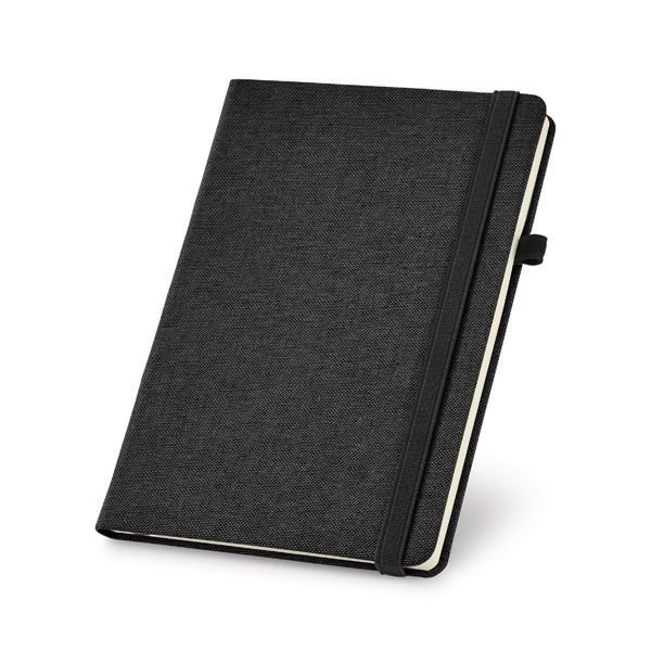 Caderno capa dura. Algodão canvas sintético. Com porta esferográfica e 96 folhas não pautadas cor marfim. Fornecido em embalagem de non-woven.