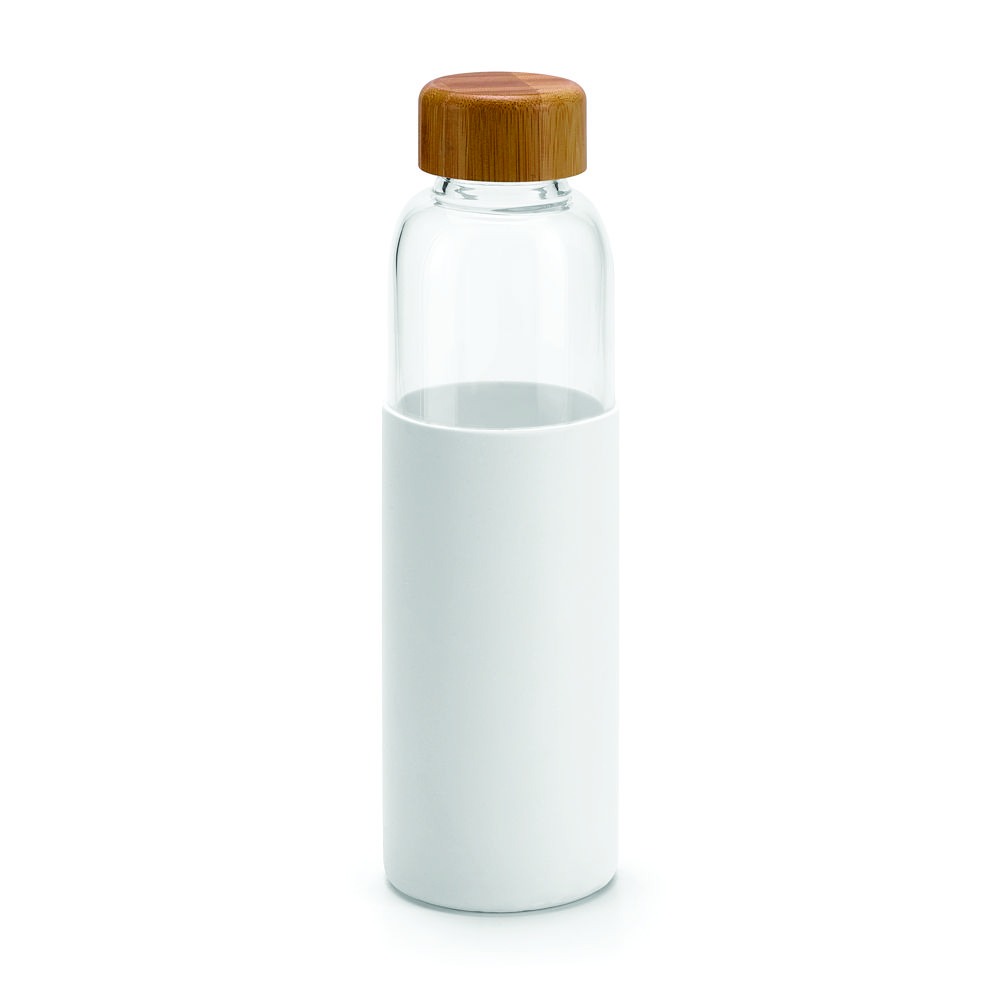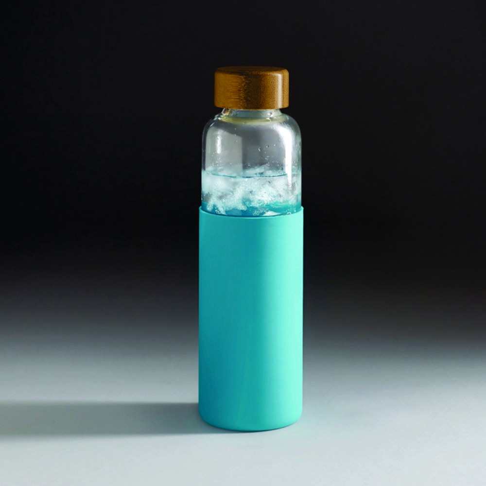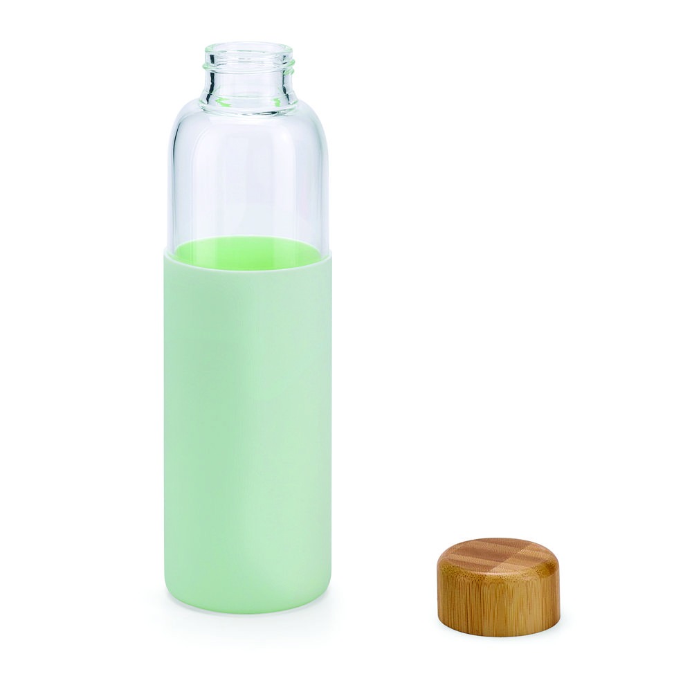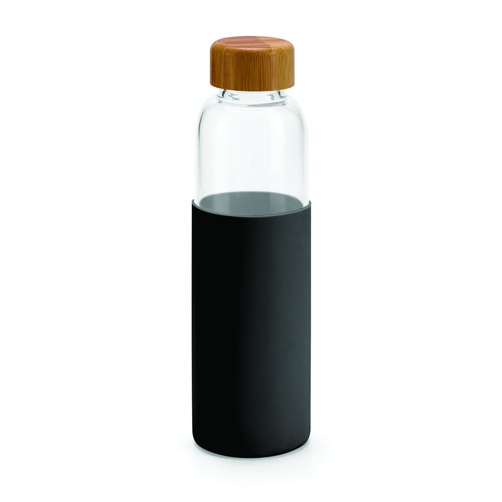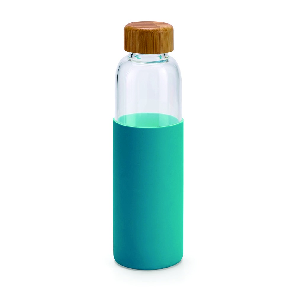 Squeeze. Vidro borossilicato. Com tampa em bambu e revestida com luva em silicone. Capacidade: 600 ml. Food grade. Fornecida em caixa.