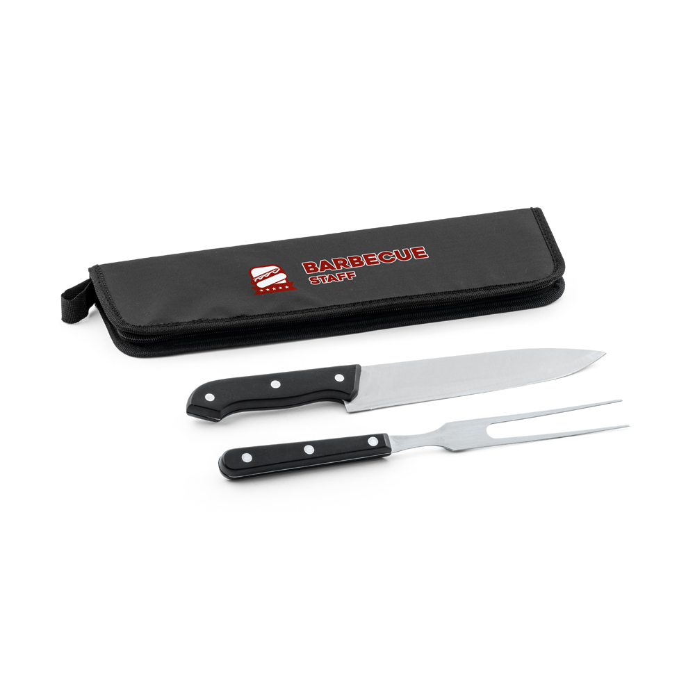 Kit churrasco. Aço inox e PP. 2 peças em estojo de 210D. Food grade.