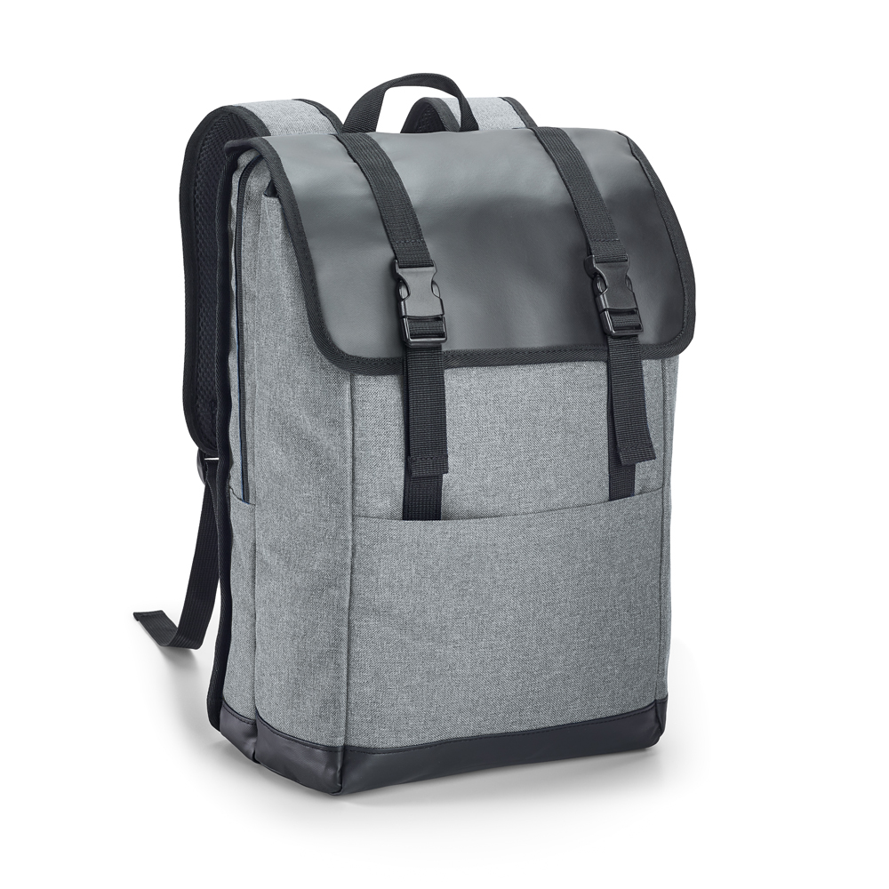 Mochila para notebook. 600D de alta densidade e tarpaulin. Com 2 compartimentos. Compartimento posterior forrado, com diversos bolsos interiores e 2 divisórias almofadadas para notebook até 17'' e tablet 10.5''. Compartimento frontal forrado, ideal para transporte de roupa (ou para lazer). Bolso frontal. Parte posterior e alças almofadadas.