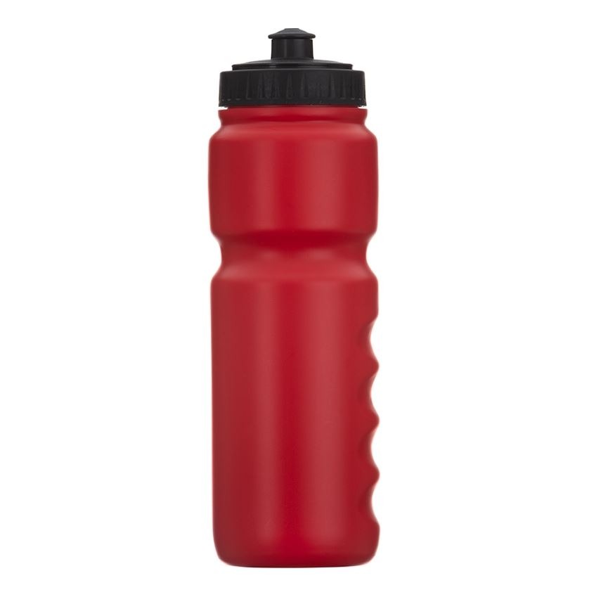 Squeeze plástico (PE) 850ml com tampa de bico rosqueável e formato para encaixe dos dedos no corpo da garrafa.