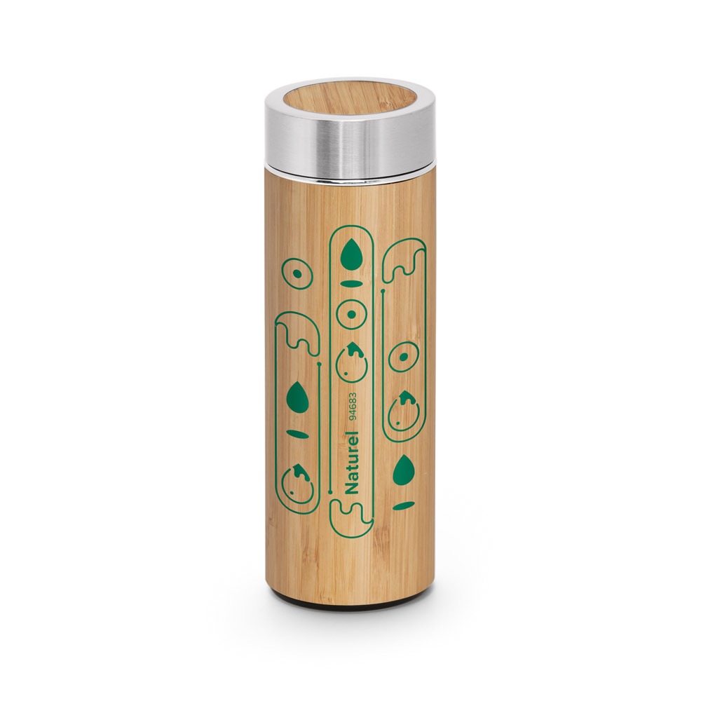 Garrafa em bambu e aço inox, com parede dupla isolada a vácuo e infusor para chá. Capacidade até 430 ml. Food grade. Fornecida em caixa presente.