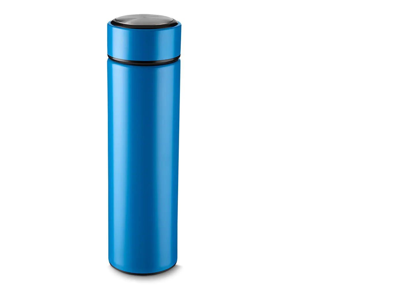 Garrafa em aço inox fosca com parede dupla de 450 ml, conserva a temperatura quente ou fria.
