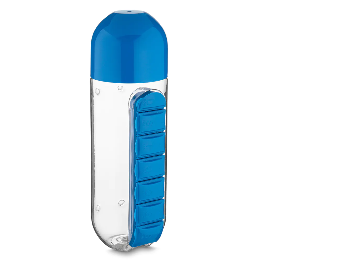 Garrafa plástica com capacidade de até 600 ml com porta pílulas destacável, plástico utilizado: PCTG (glicol - polietileno copolímero PCT modificado). Tampa rosqueável e anel de silicone para vedação.
